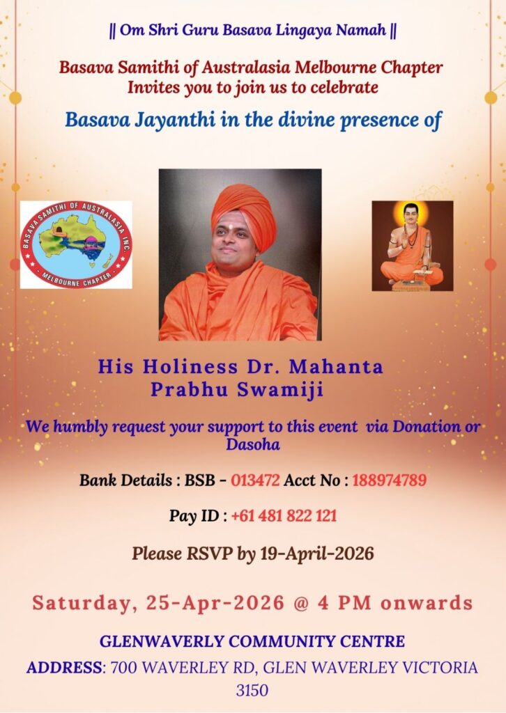 Basava Samithi of Australasia Melbourne chapter is celebrating Basava Jayanthi every year usually it will be in April month.