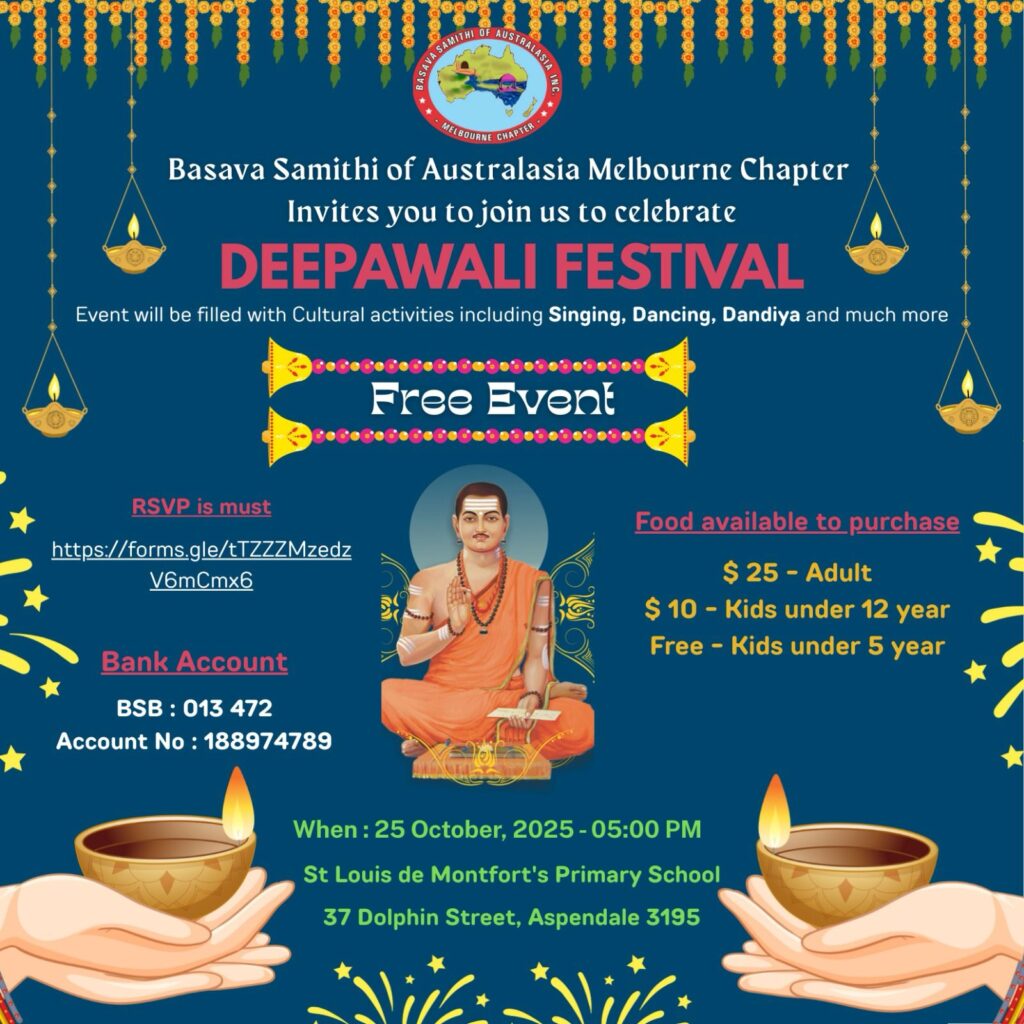 Basava Samithi Melbourne chapter every year celebrates Deepavali festival. This event is filled with Cultural activities including singing, dance, dandiua and much more.